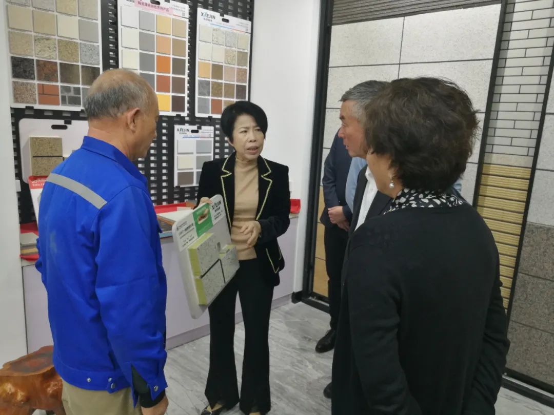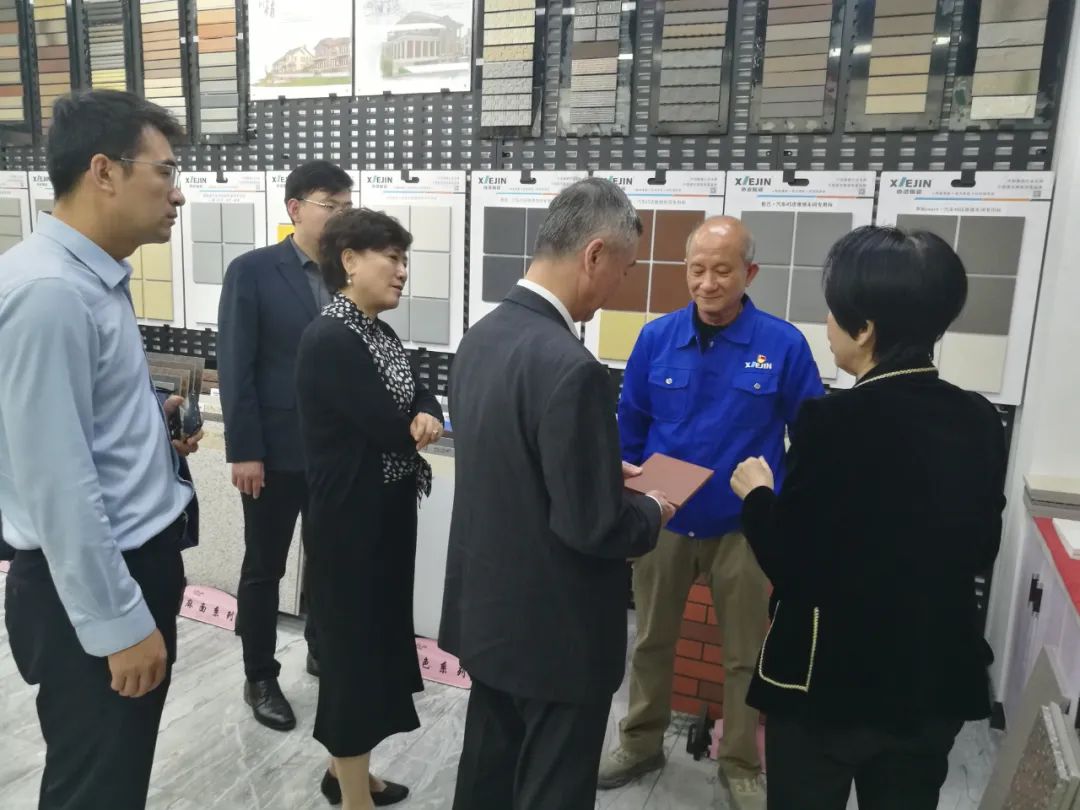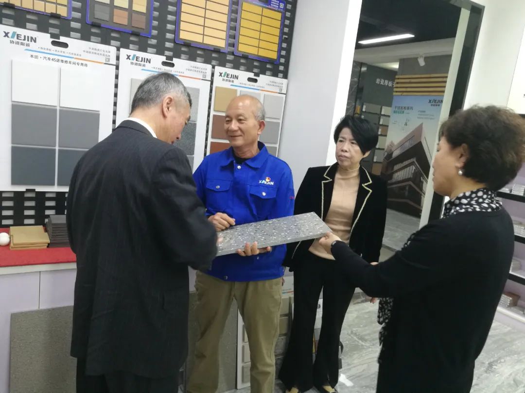 繆會長一行在王家助董事長、楊寶貴副董事長、王少華總經(jīng)理的介紹下饒有興趣地參觀了產(chǎn)品展廳,對協(xié)進研發(fā)生產(chǎn)的一系列大規(guī)格薄板、大板、陶瓷薄板復合保溫一體板、地鋪石等綠色節(jié)能新產(chǎn)品,以及諸多產(chǎn)品在泛家居領域的創(chuàng)新與運用給予肯定,并提出寶貴意見。