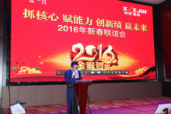 公司總經(jīng)理王少華在致辭中表示,2016年是關(guān)系企業(yè)生存的關(guān)鍵一年,希望全體協(xié)進(jìn)人和經(jīng)銷商能夠更進(jìn)一步發(fā)揚(yáng)“攜手創(chuàng)輝煌,創(chuàng)新求卓越”的協(xié)進(jìn)精神,精誠團(tuán)結(jié)、齊心協(xié)力,確保企業(yè)渡過這一艱難時(shí)期。在這期間,一是牢牢抓住產(chǎn)品創(chuàng)新這個(gè)核心。通過加快對新產(chǎn)品的研發(fā)投入,促進(jìn)產(chǎn)品升級升值。比如公司最新研發(fā)的漢文化磚系列和小規(guī)格仿古磚系列新產(chǎn)品,就是為企業(yè)穩(wěn)健發(fā)展創(chuàng)造新的增長動(dòng)力。二是賦予能力。通過持續(xù)的學(xué)習(xí)培訓(xùn),進(jìn)一步提高全體人員的經(jīng)營管理能力、勞動(dòng)技能水平和營銷業(yè)務(wù)技能。三是創(chuàng)新營銷模式。借用互聯(lián)網(wǎng)思維,開創(chuàng)新一代的營銷模式。2016年公司對營銷體制進(jìn)行改革,讓更多有能力的員工在企業(yè)平臺(tái)上打拼一番新的事業(yè)。四是精細(xì)化生產(chǎn)管理。通過流程再造,有效控制成本,同時(shí)提高產(chǎn)品質(zhì)量。