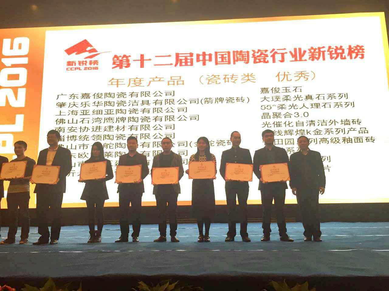 熱烈祝賀南安協(xié)進(jìn)建材有限公司的“光催化自清潔外墻磚”在第十二屆中國(guó)陶瓷行業(yè)新銳榜評(píng)選活動(dòng)中,榮獲“年度優(yōu)秀產(chǎn)品”。